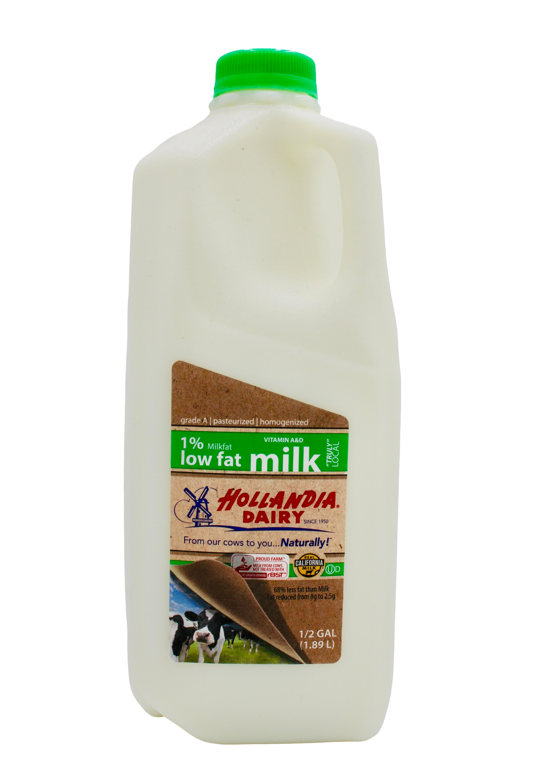 | Hollandia Dairy one percent milk, comes conveniently packaged as a half gallon. This low fat one percent milk is sourced from Certified Humane farms in Southern California. |