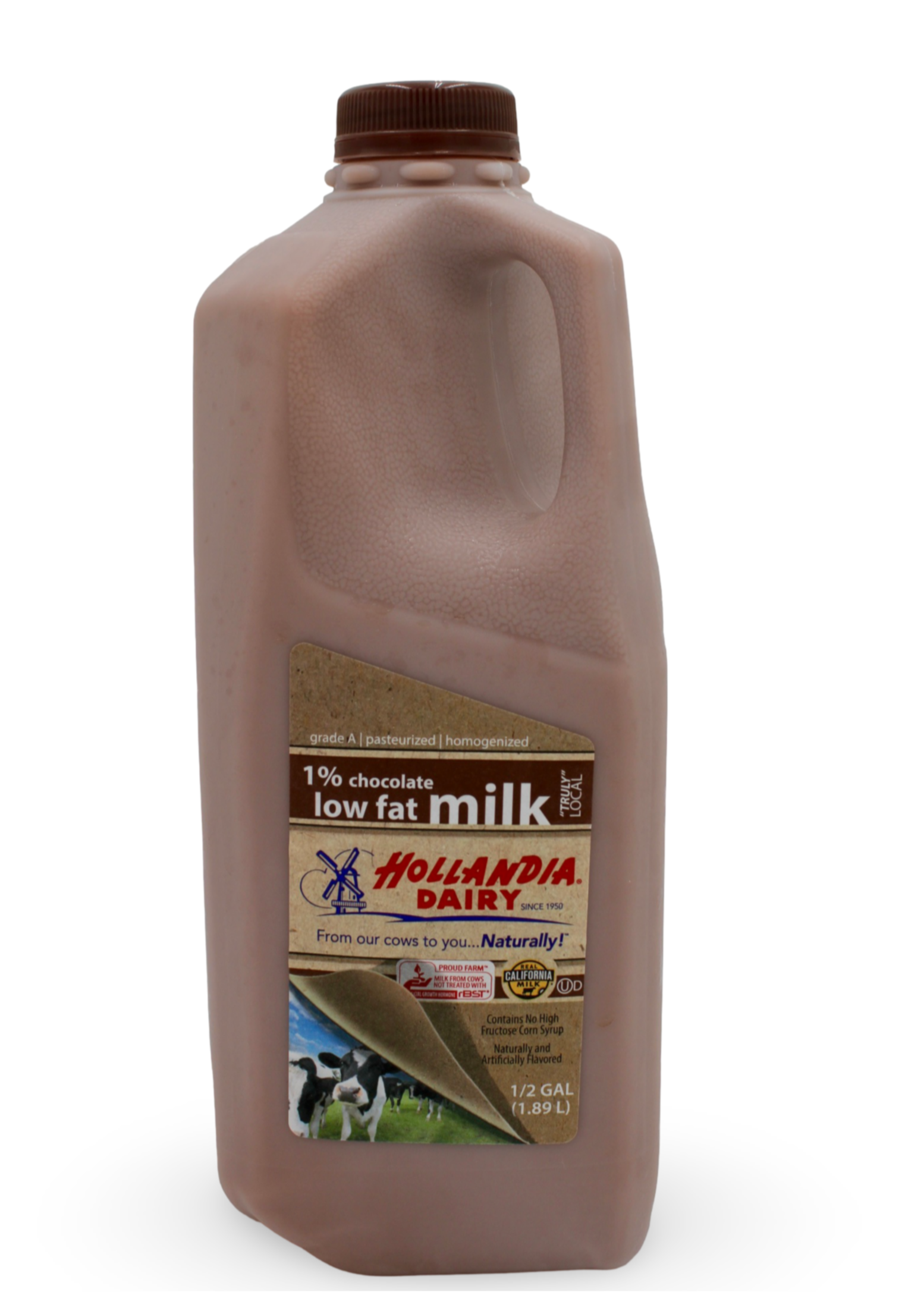 Hollandia Dairy 1% Chocolate Milk, packaged conveniently in a half gallon. This fan favorite is sourced from Certified Humane farms in Southern California.