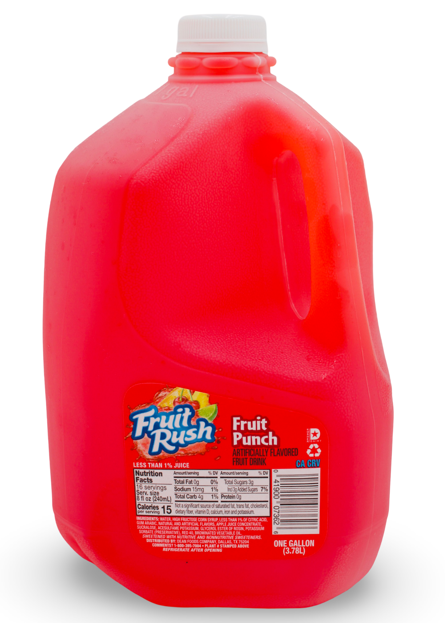 Fruit Rush Fruit Punch in 1-gallon containers offers a refreshing and fruity flavor.