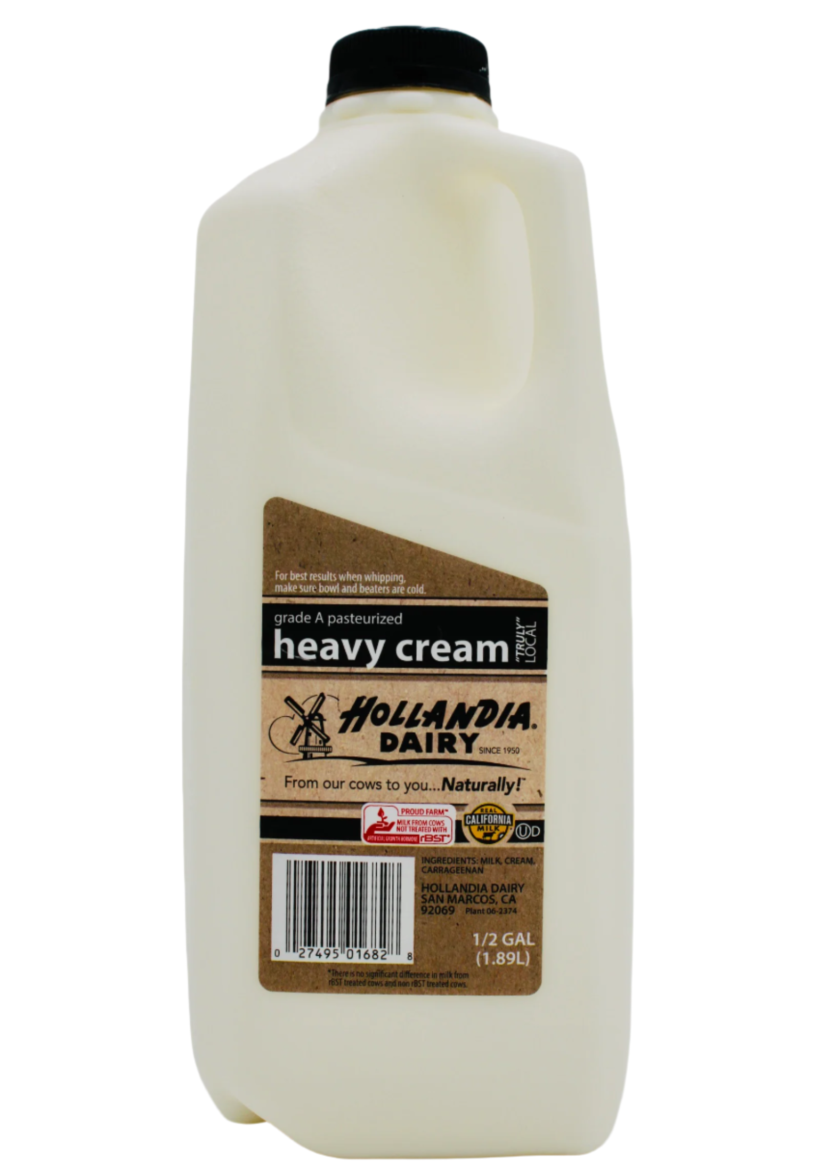 Hollandia Dairy heavy cream is 38-40% butterfat and is conveniently packaged as a half gallon. All natural and always fresh from our happy socal cows!
