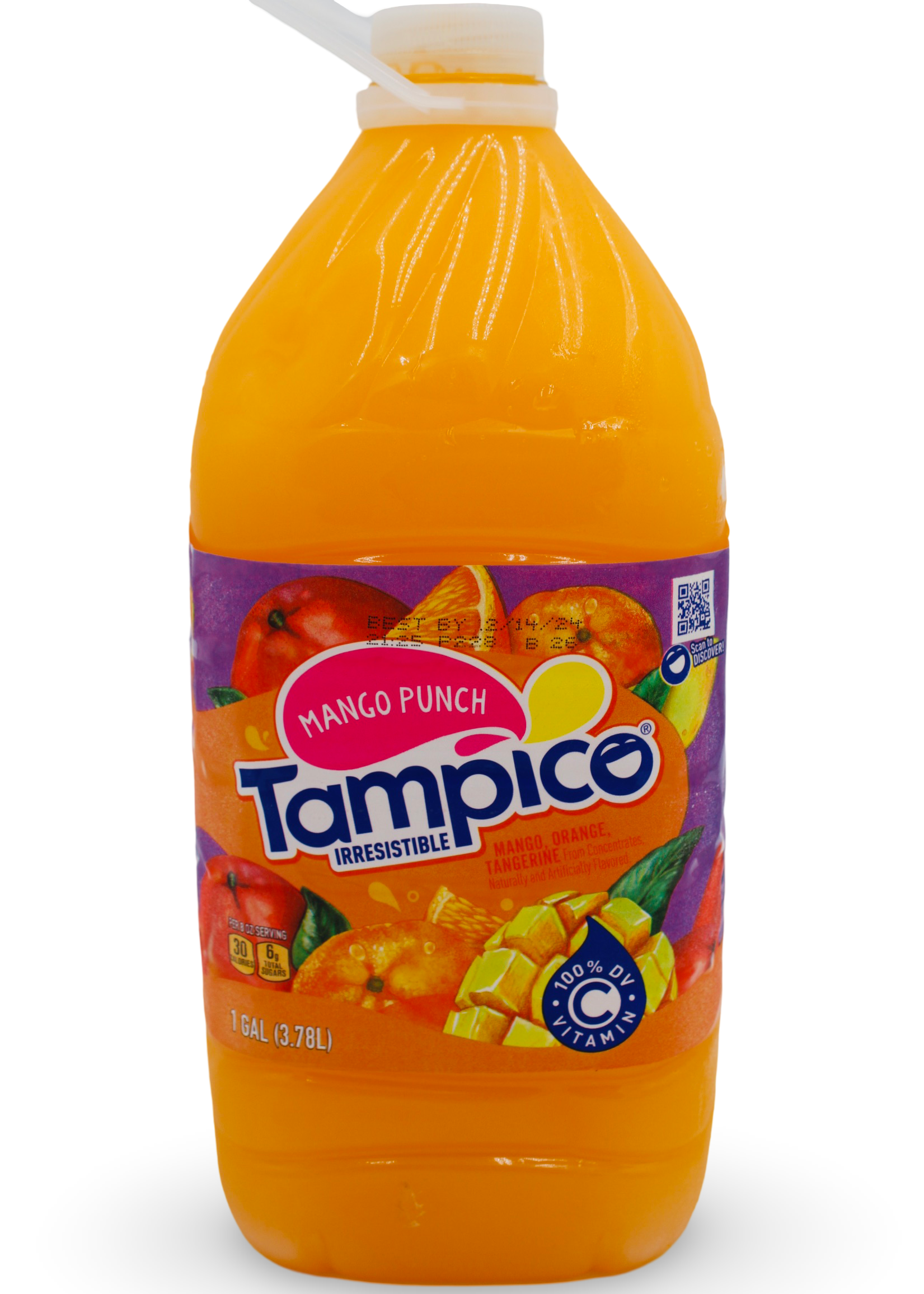 Tampico Mango Punch is conveniently packaged in gallon containers and combines the lush flavors of mango, orange, and tangerine for a tropical taste. It offers 100% daily value of vitamin C with only 30 calories and 6g of sugar per serving.
